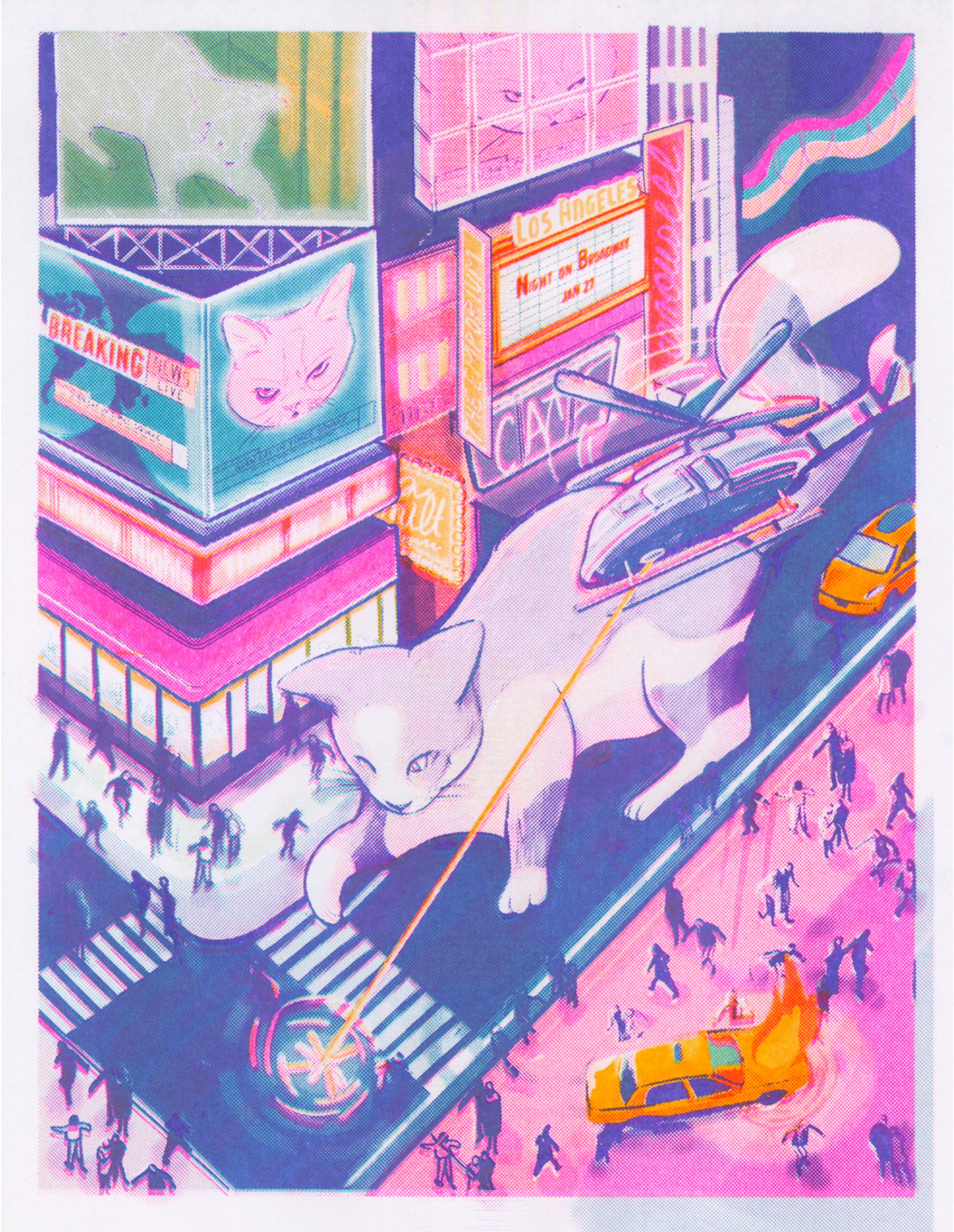 Risograph print: Cyan, Magenta, Yellow, Cornflower.